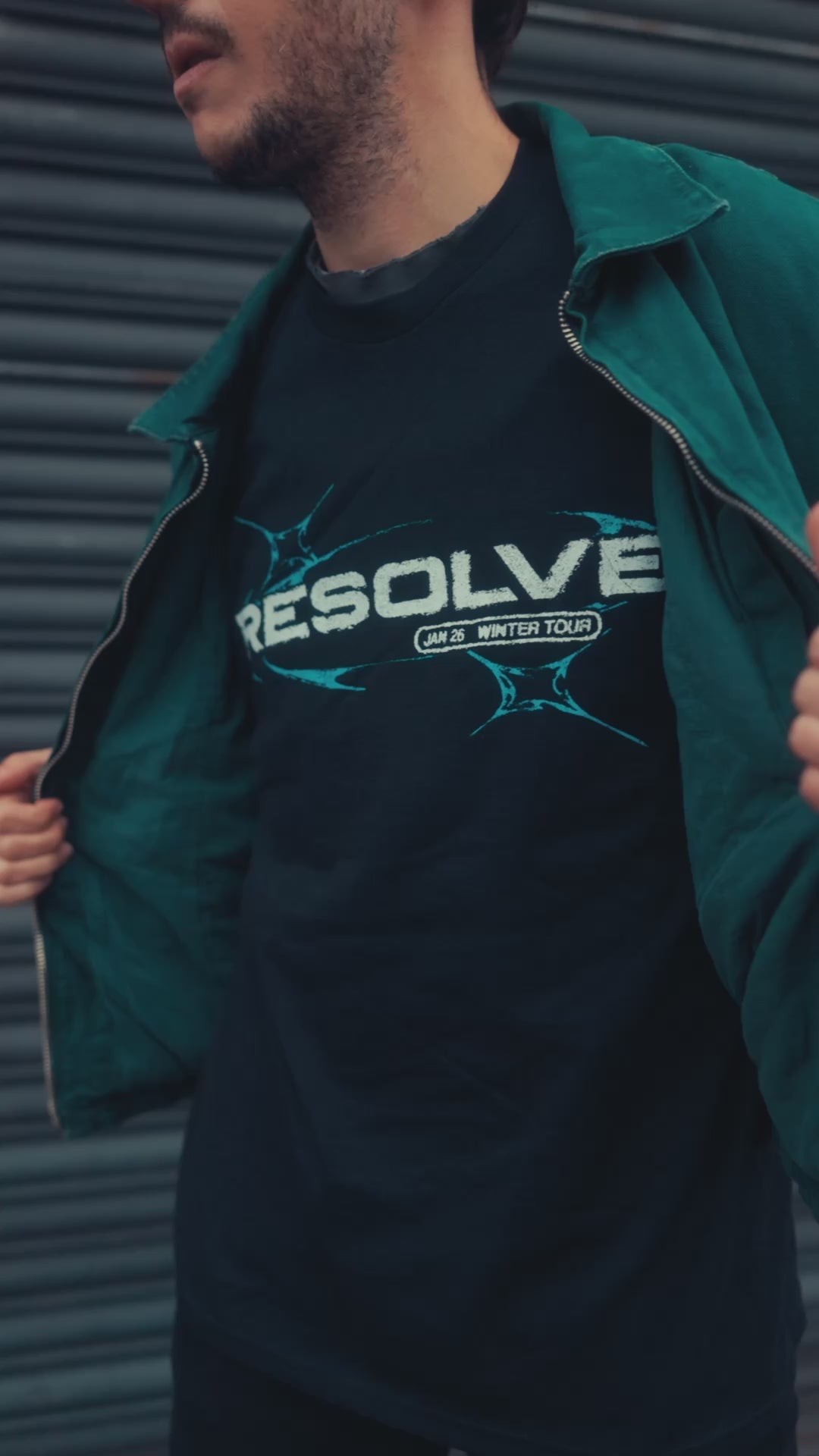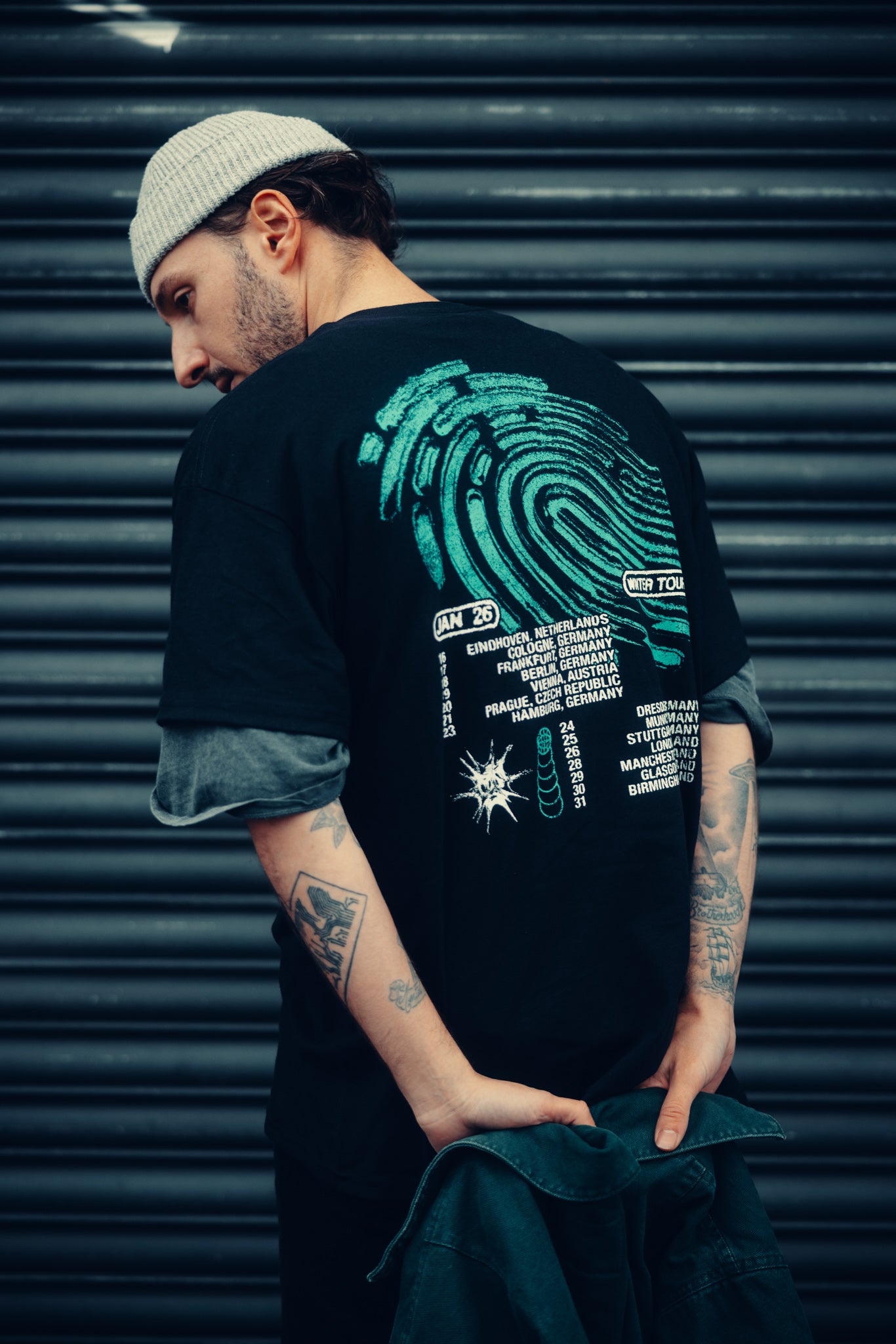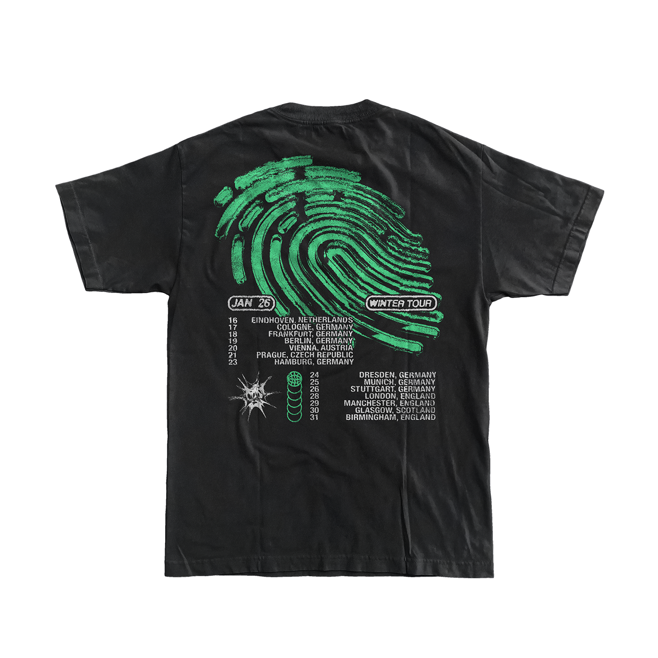 Tour Tee Winter 2026 with front and back print on a black Gildan Heavy Cotton t-shirt.